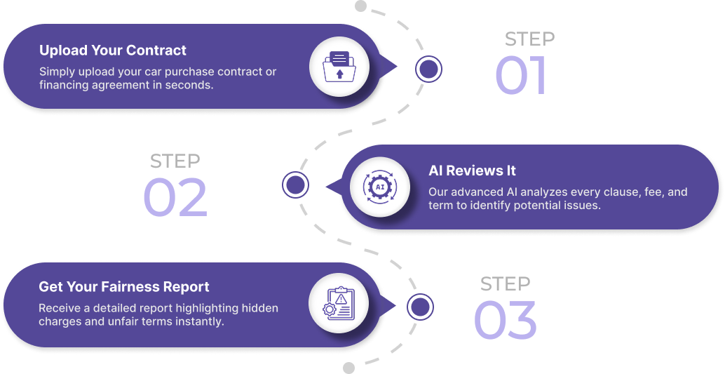 We don’t work for dealerships. Our AI is programmed to serve only your financial interests, detecting terms that favor the seller over the buyer.